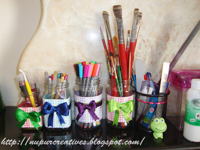 These are decorated jam and honey bottles used as pen-stands... I use them to keep my embossing tools, Glitter pens, fine tip sketch pens & brushes. The black wire-mesh pen-stand holds general tools like pen, pencil ruler, etc. The cute little green froggy is a pencil sharpener (it was a return gift I got from my little cousin's birthday party .... isn't he cute... :) )