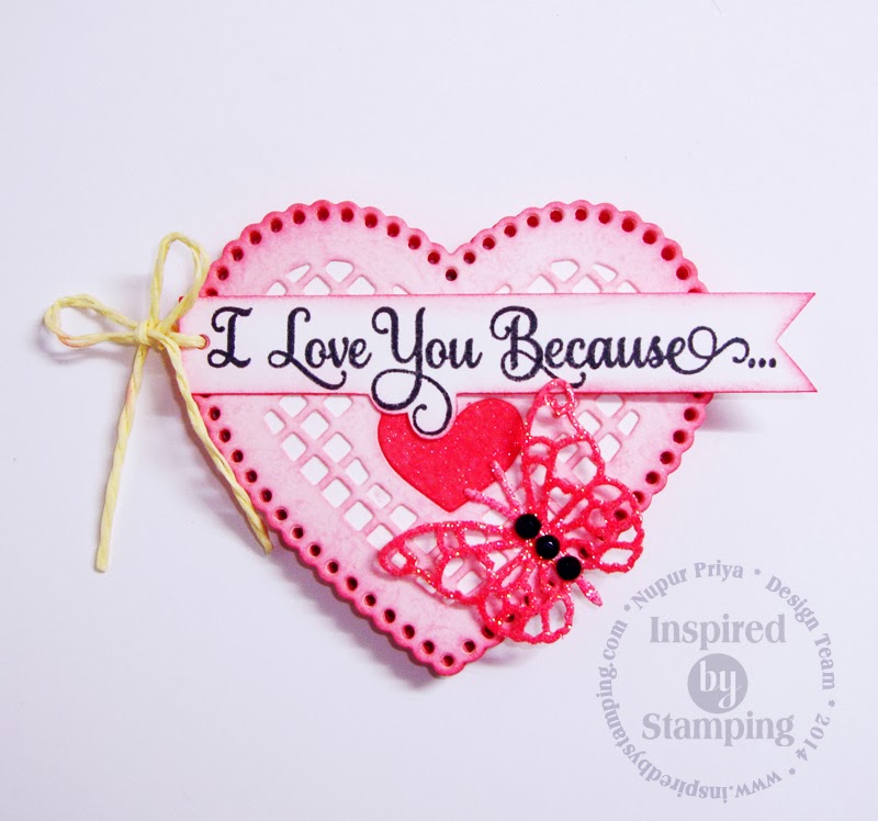 I have stamped 'I Love You Because' on a banner & then I added the decorative cover with glittered heart & butterfly...